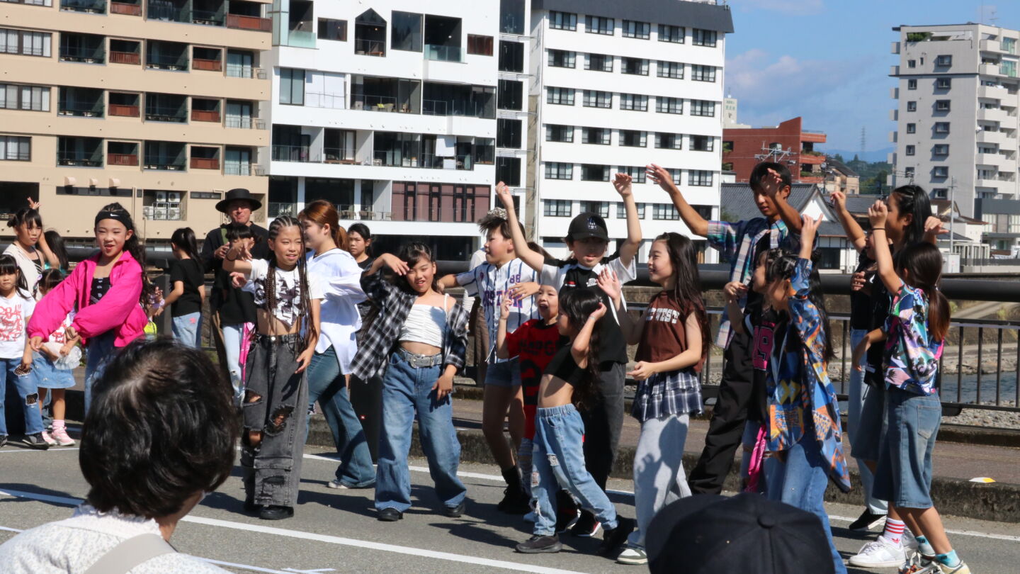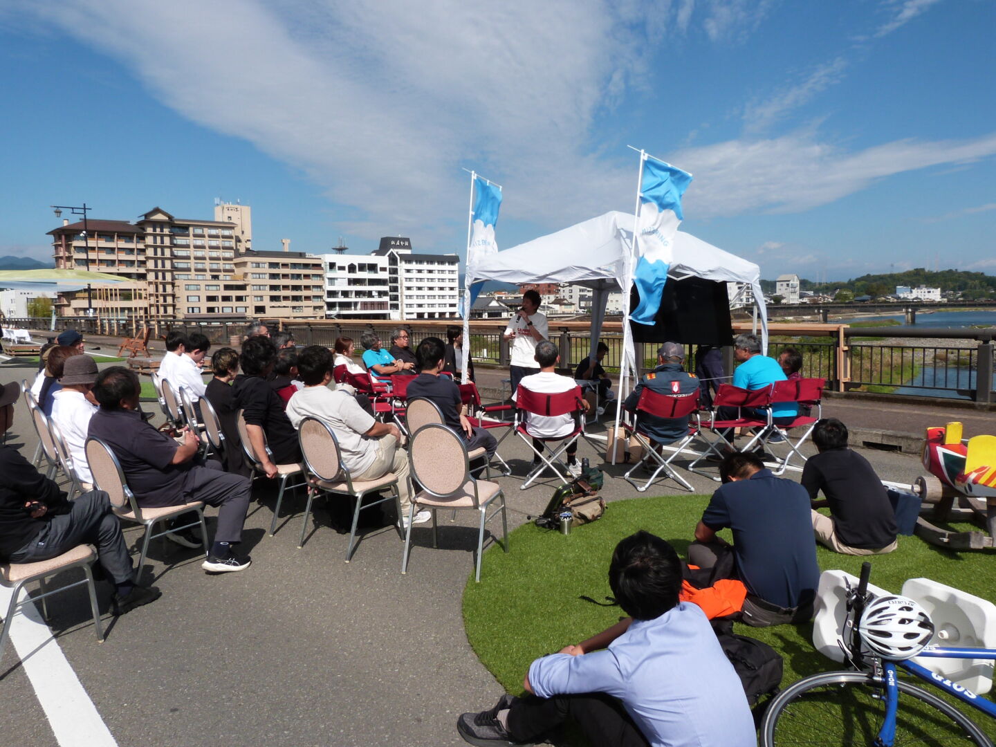 球磨川上流に架かる大橋の橋上を広場に見立て、中洲の中川原公園も一緒に、みんなの居場所として活用する可能性を検証してみよう、ということで、10月25,26日に様々な社会実験が行われました。