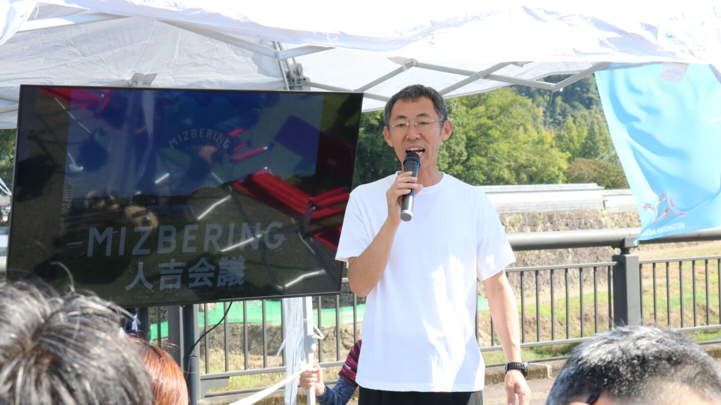 「MIZBERING人吉会議」の開会挨拶は、松岡隼人・人吉市長。ずっと人吉で暮らしてこられた松岡市長も、昭和57年、そして令和2年と、2度の水害を経験されたそうです。